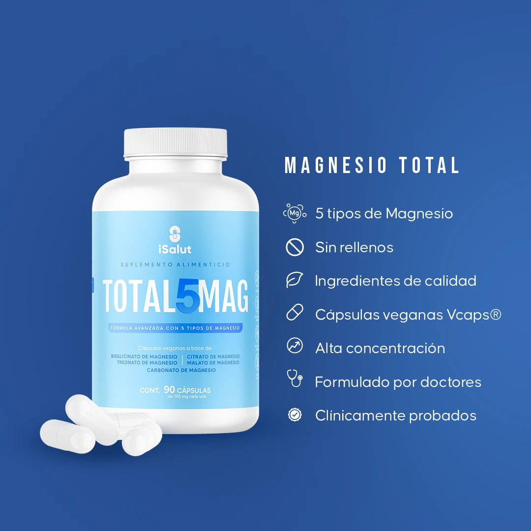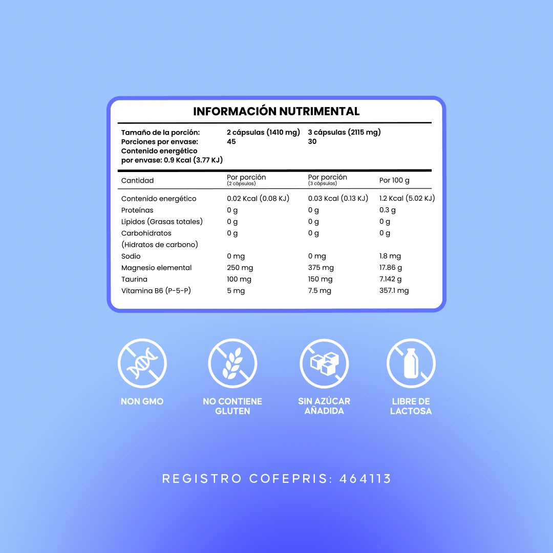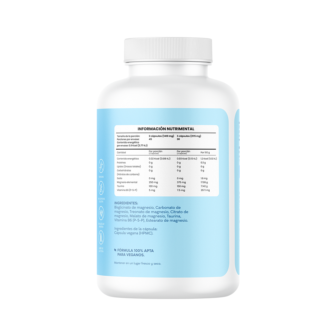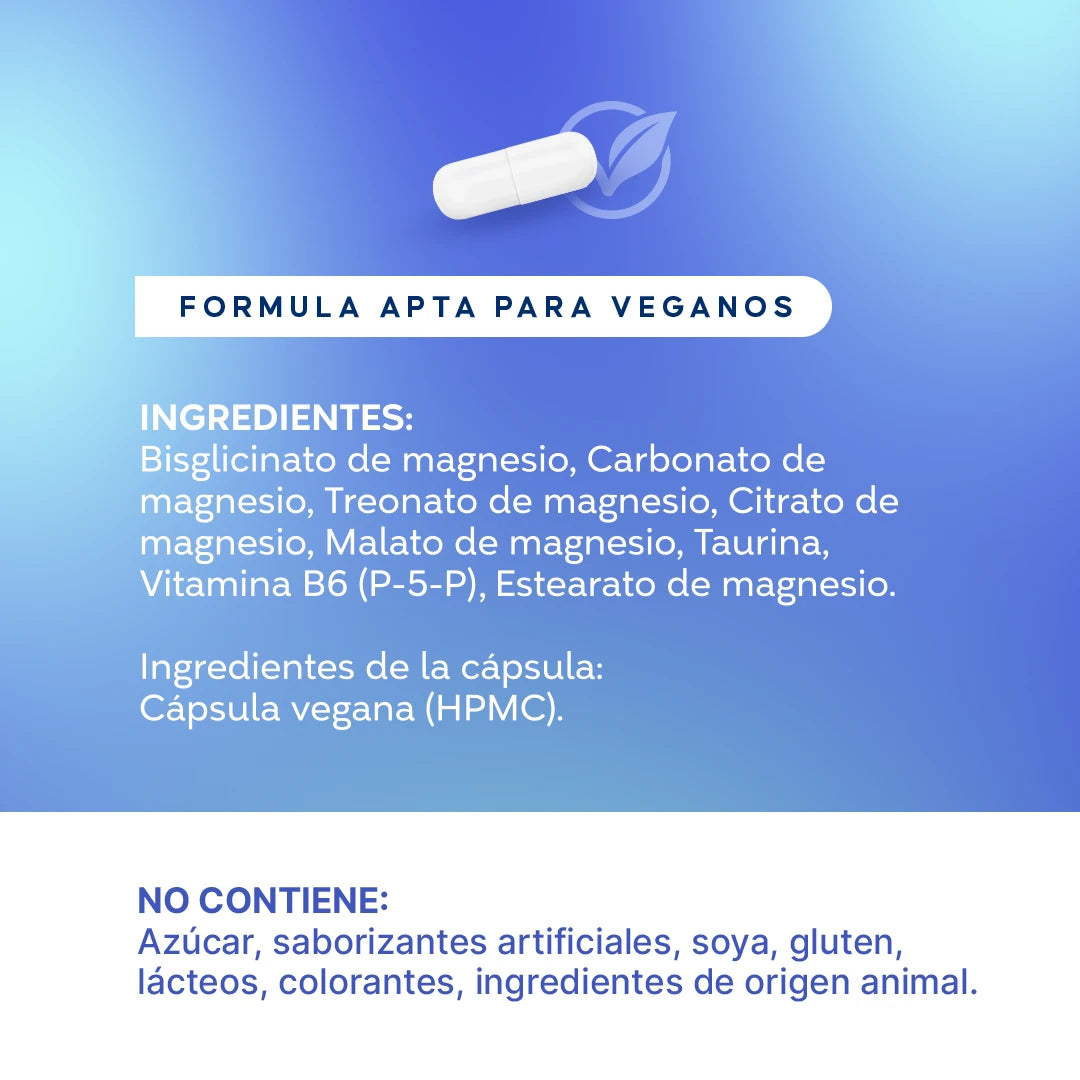 Con 90 cápsulas por envase, esta fórmula avanzada está diseñada para ayudarte a mantener tu bienestar diario durante 45 días. Cada porción aporta 375 mg de magnesio elemental proveniente de 5 tipos distintos de magnesio: bisglicinato, treonato, malato, citrato y carbonato.